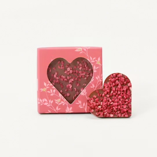Chokladhjärta med Hallonströssel tillsammans med nougatfyllning och toppad med hallonflingor blir ditt bukett extra uppskattad.