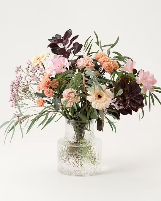 Våra florister i Helsingborg binder varje bukett för hand med en livfull mix av säsongens blommor och grönt. Resultatet blir en personlig, glad och festlig bukett som lyser upp dagen – hemma, på kontoret eller direkt vid dörren.